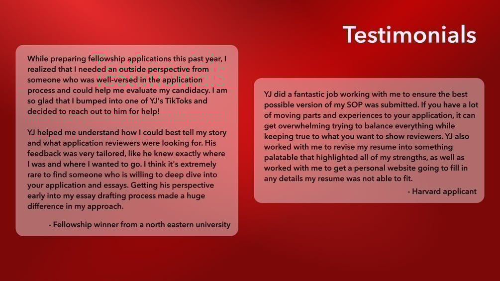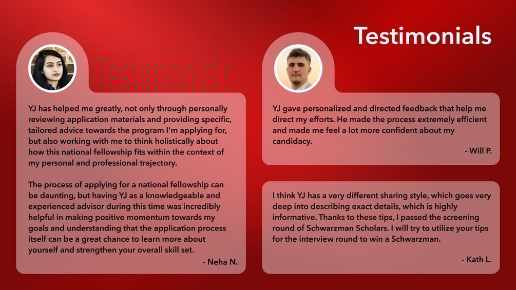 I'm YJ (Yongjun) Heo, and I was awarded three national fellowships (Fulbright, Luce Scholars Program, and George Mitchell Scholarship). I have advised dozens of national fellowship winners over the last decade, including my younger brother, who was a Schwarzman Scholar. I have directly helped students and recent graduates win the Rhodes, Mitchell, Marshall, Fulbright, Schwarzman, Gates Cambridge, Luce, Rangel, Watson, and others. As a product designer, I created and maintain the application system for a well-known national fellowship. Hundreds of college students and recent graduates have asked me for resources to help them apply, and I'm consolidating and sharing as much as I can here and on nationalfellowship.com and nationalfellowships.com. By coincidence, life circumstances, and direct experiences, I believe I know more about these programs than almost anyone else, and I want you to learn everything that I have learned here.
