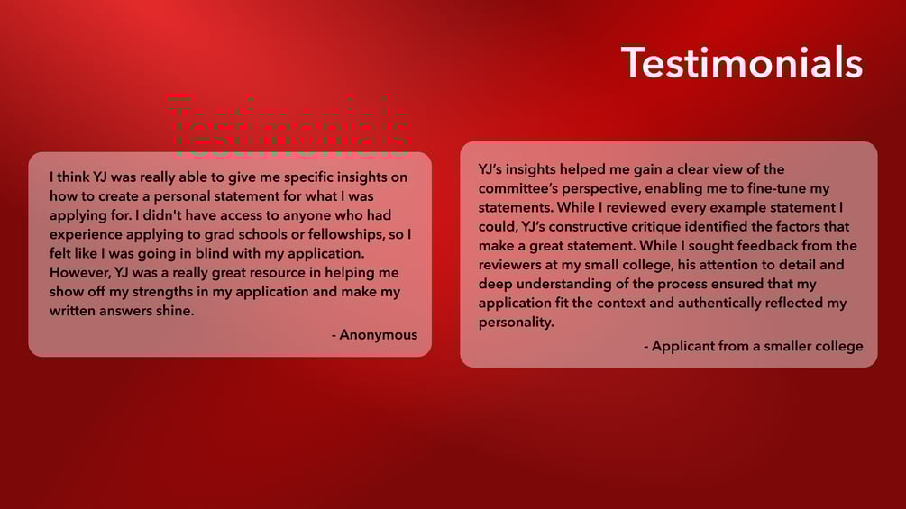 During this last cycle alone, I've had close to a dozen winners for most of the above national fellowships. The guide itself covers (likely) 60-80% of everything I know. That last 20-40% is more tailored to your individual candidacy, and you'd get the full "100%" if you also speak with me directly throughout the process.