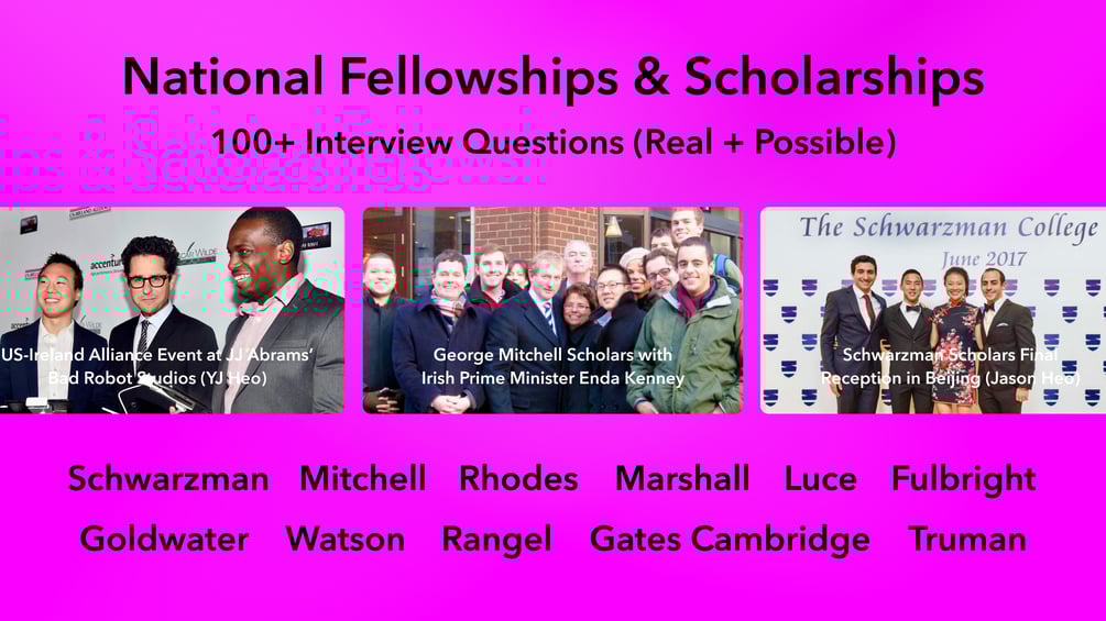 These 100+ Questions come from 1) my own experiences interviewing and winning national fellowships 2) the experiences of those who I have voluntarily supported over the last decade (dozens who have won) and 3) my years of experience being involved fellowship programs directly. Some of these questions were asked in real interviews, and others are potential questions that may arise this year during 'selection weekend.'