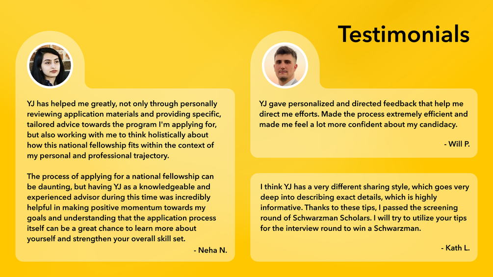 Only hundreds (out of the tens of thousands of candidates) who apply for national fellowships like the Rhodes, Schwarzman, Mitchell, Marshall, Luce, Gates Cambridge etc. will receive an interview. The interview is the most important aspect of getting selected as a finalist after you submit your application. I have helped hundreds of students apply over the last decade, and I've helped dozens win. I know what generally works and what might not.
